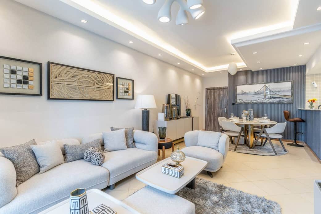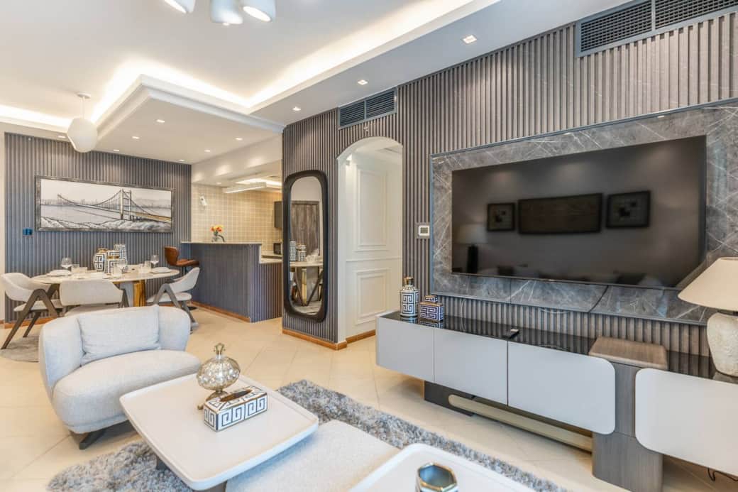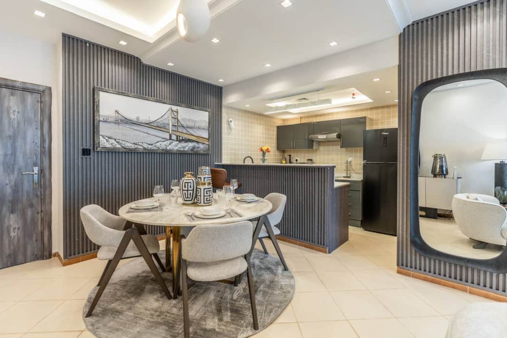 Step into a thoughtfully furnished space featuring tasteful interiors, a spacious living area, and a cozy dining setup perfect for relaxing or entertaining. The living room is equipped with a large Smart TV, making it easy to unwind after a day exploring the city.